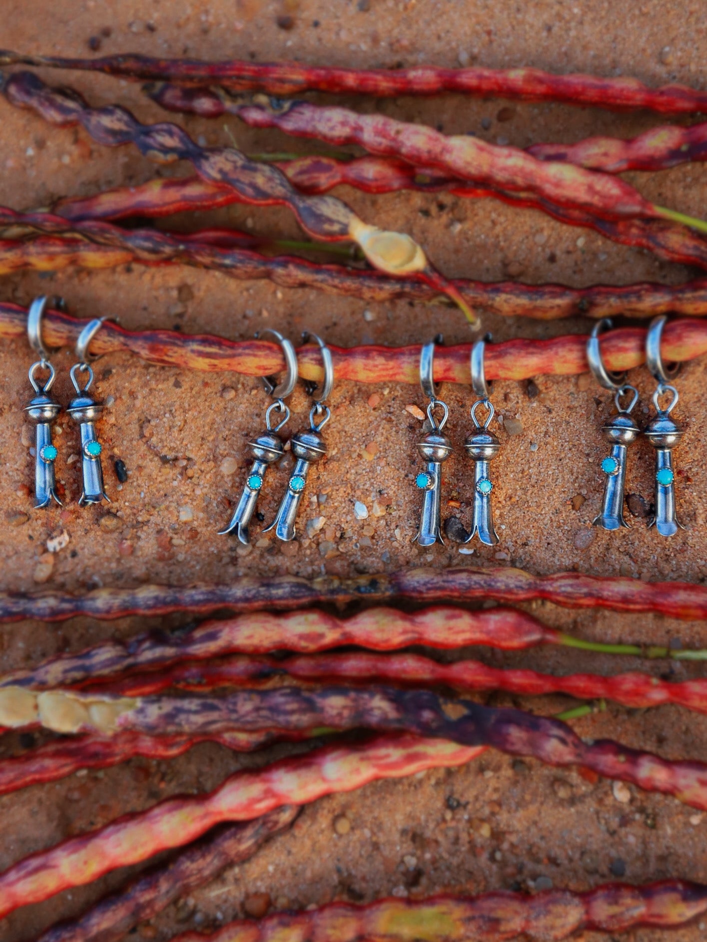 Sterling silver squash blossoms on sterling silver huggie hoops. Antiqued to perfection adorned with kingman turquoise.